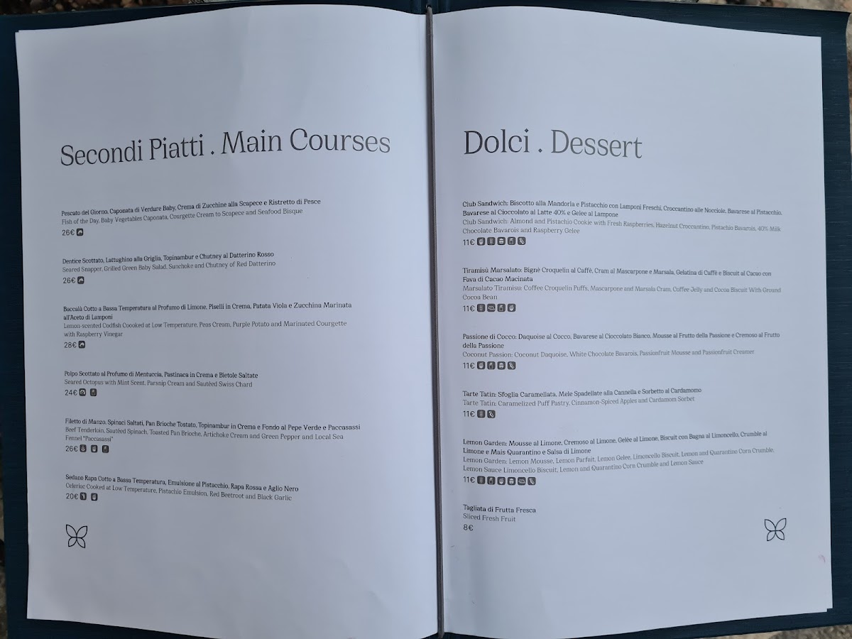 Dolci e dessert offer sweet dishes such as pistachio biscuit with raspberry jelly and vanilla cream, as well as a coconut-based dessert combining biscuit, white chocolate, banana cream, passion fruit jelly, pineapple, lime mousse, and a white chocolate glaze.