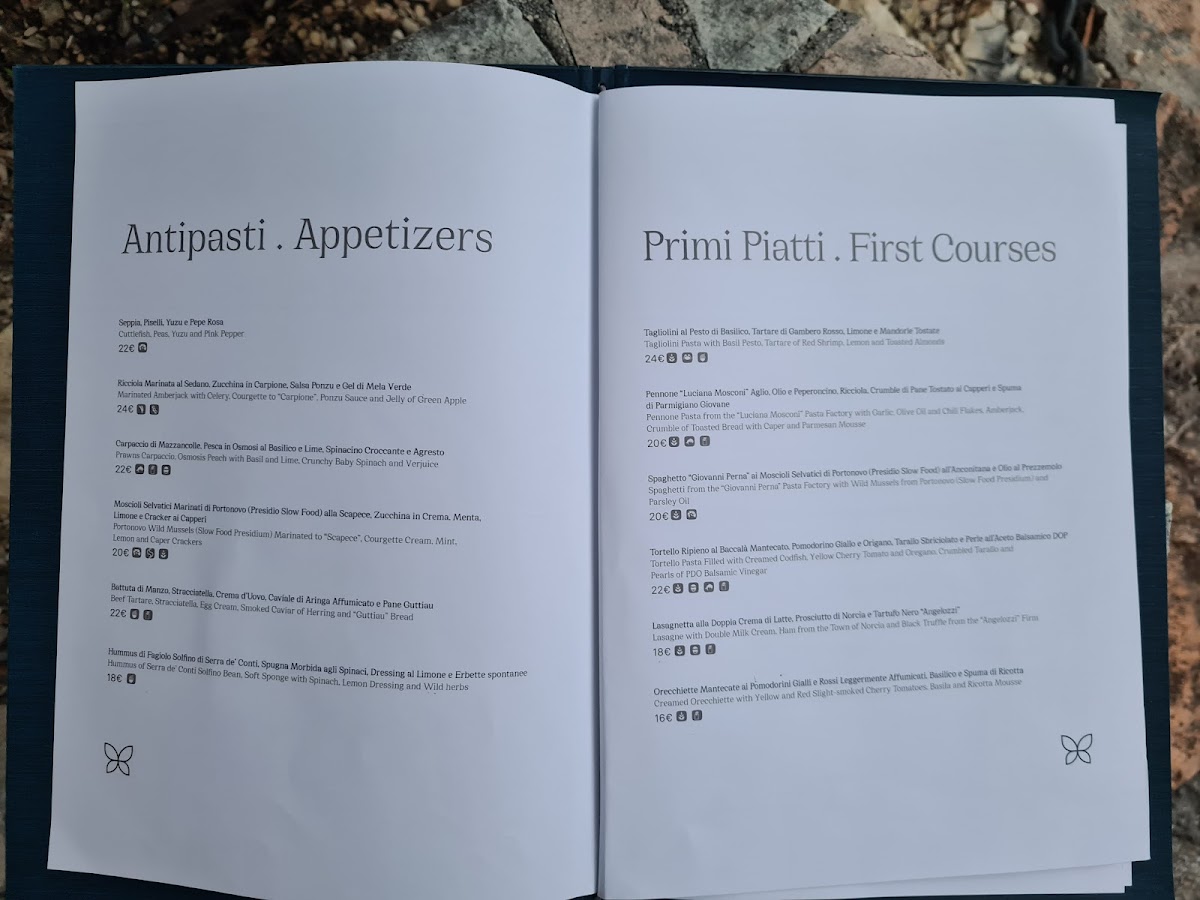 Primi piatti include homemade pasta options paired with local ingredients, such as spaghetti with wild Portonovo moscioli prepared "all'anconitana," and coffee-flavored tagliolini served with sea urchins, garlic, oil, chili pepper, and a hint of lemon.